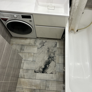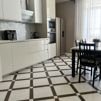Красивый кафель плавно «перетекает» из входной группы в кухню-гостиную, создавая эффект единого, стильного пространства.