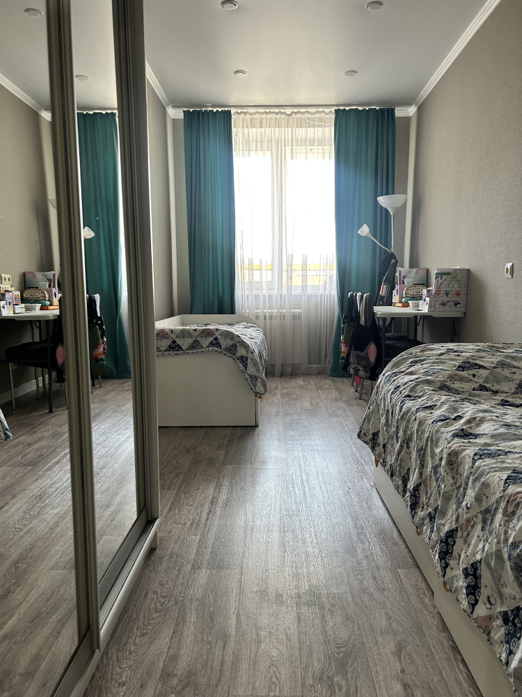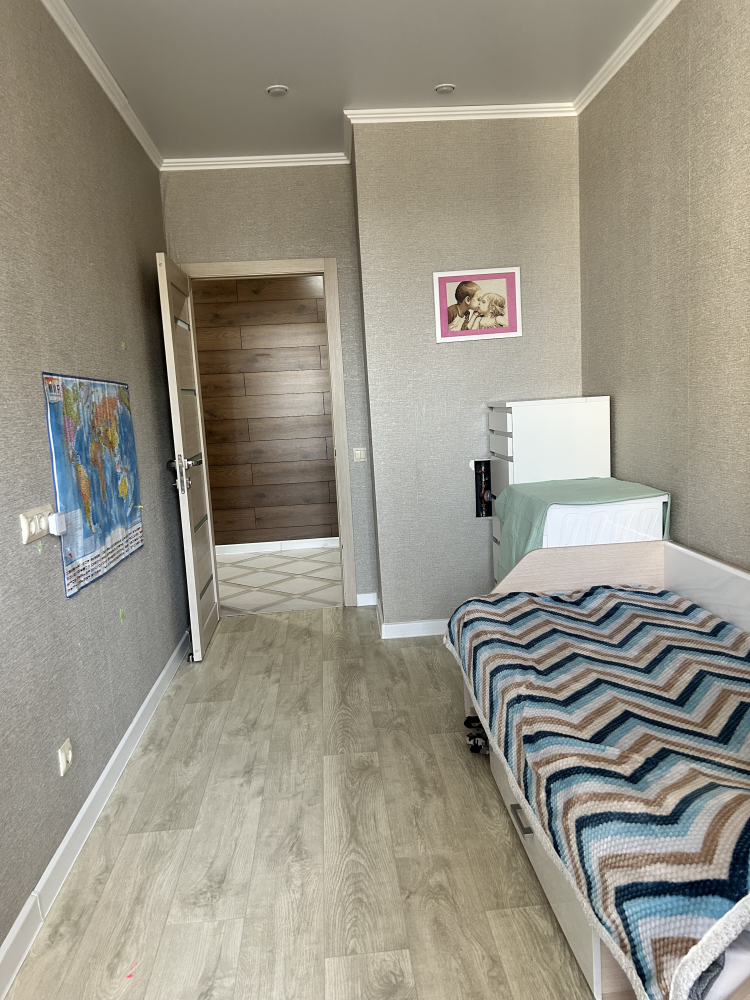• Спальни выполнены в нейтральных светлых тонах, пол — ламинат.